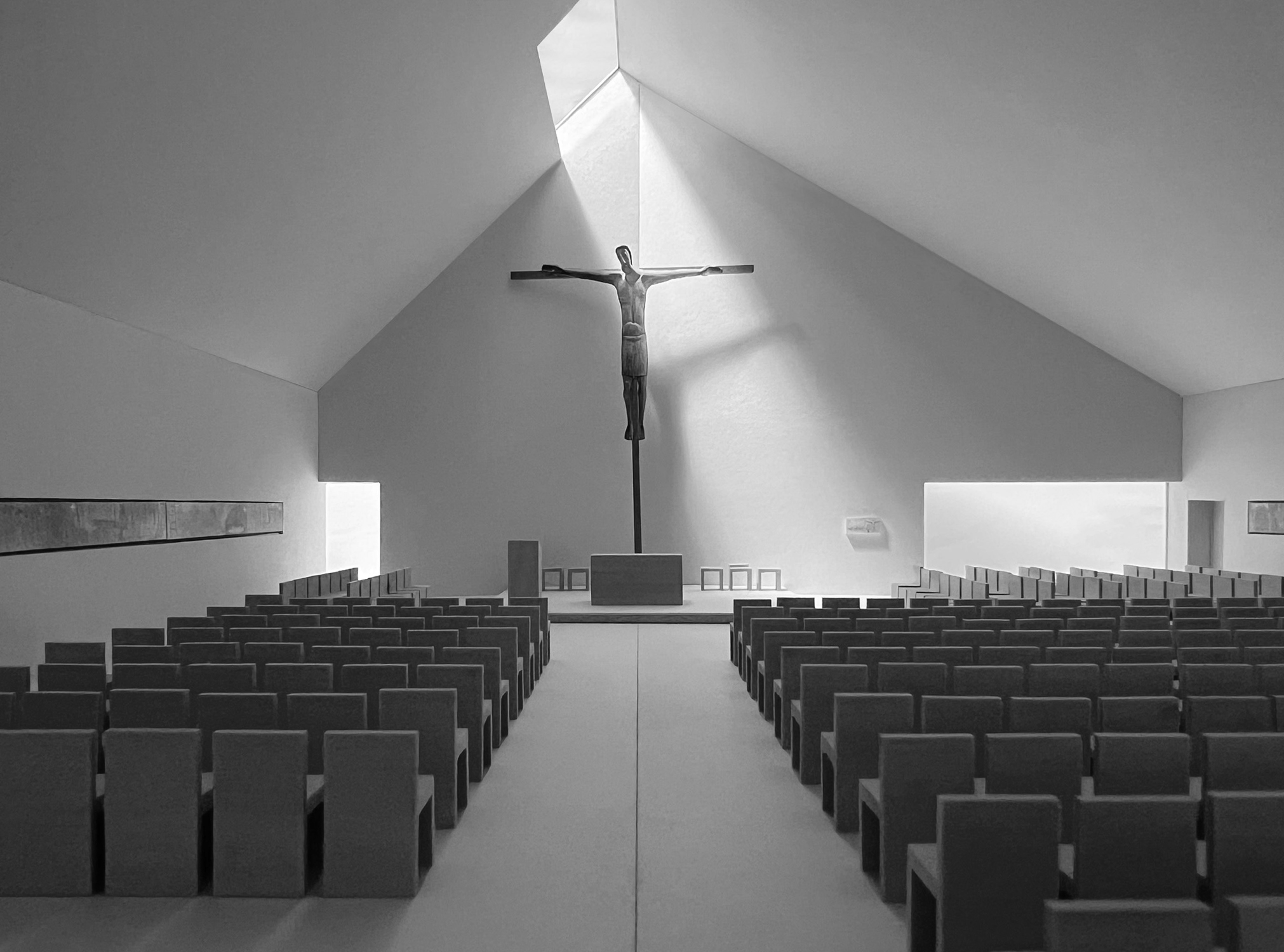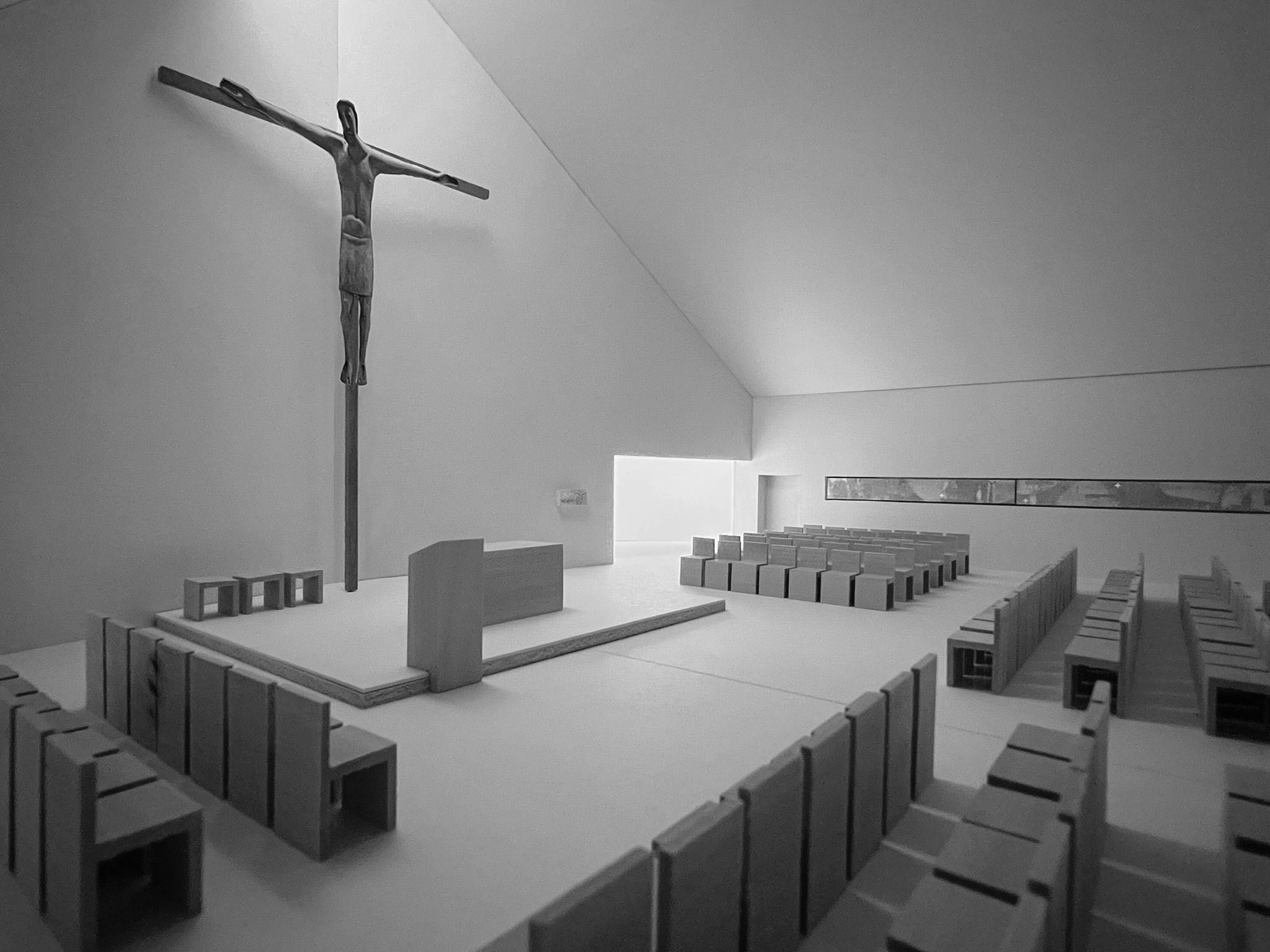 Auszug aus der Machbarkeitsstudie: VERWANDLUNG / TRANSFORMATION Der Neubau der Kirche Mariä Himmelfahrt versteht sich als Fortführung und Neuformulierung eines gewachsenen Ortes. Wo der Bestand weichen muss, entsteht kein Bruch, sondern eine Transformation – ein behutsames Weiterbauen im Geiste des Alten, mit den Mitteln der Gegenwart. In einer Zeit, in der sich die Kirche verkleinert und neu orientiert, spiegelt der Bau diese Bewegung räumlich wider: Er ist konzentriert, klar und reduziert auf das Wesentliche. Das klassische, einschiffige Volumen mit hohem Satteldach erinnert an vertraute Archetypen sakraler Architektur, ohne sie zu zitieren. Die leicht aufgeneigten Giebelflächen formen eine schlichte, aber ausdrucksstarke Geste – ein Heben und Öffnen des Raumes, das an die Idee der Himmelfahrt erinnert. Das Licht, das über ein Oberlicht in den Raum fällt, ist zentrales Gestaltungsmotiv. Es lässt das Innere lebendig werden, macht das Unsichtbare erfahrbar. So entsteht ein Raum, der zugleich Schutz bietet und Offenheit vermittelt – ein Ort des Innehaltens, der Sammlung und der Erneuerung. Mariä Himmelfahrt ist kein Wiederaufbau des Vergangenen, sondern ein bewusst kleinerer, aber inhaltlich verdichteter Neubeginn – ein Zeichen des Glaubens.